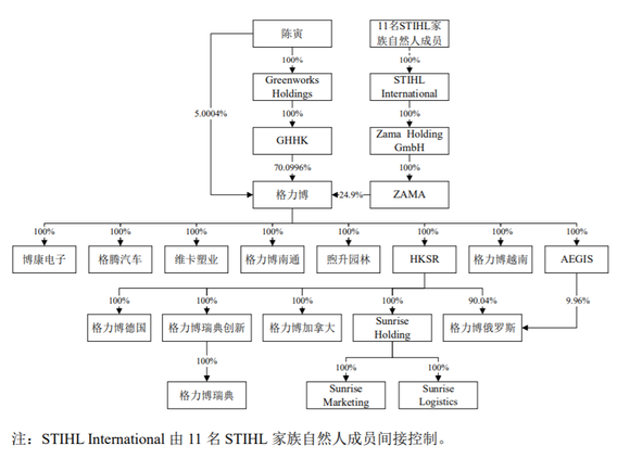 2020年8月31日,常州格力博(格力博前身)收购大股东GHHK控股的所有子公司的股权/股份,具体包括HKSR、AEGIS、格腾汽车、维卡塑业的100%股权/股份。9月1日,常州格力博又收购了实控人陈寅及其配偶控制的煦升园林100%股权。同时,STIHL退出在GHHK的35%持股,转而通过其全资子公司ZAMA直接持股常州格力博24.90%。
