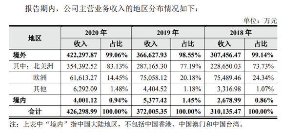 招股书显示,报告期内,格力博主营业务收入中境外收入占比分别为99.14%、98.55%和99.06%,几乎是纯出口企业,出口主要集中于北美及欧洲地区,为公司营业收入和利润的主要来源,对公司经营业绩有较大影响。