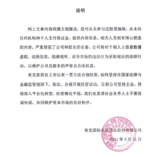“公司将对个别人士恶意散播虚假、诋毁信息,混淆视听、误导市场的违法行为采取相应的法律行动,以维护公司及股东的声誉及合法权益。”美克家居表示。