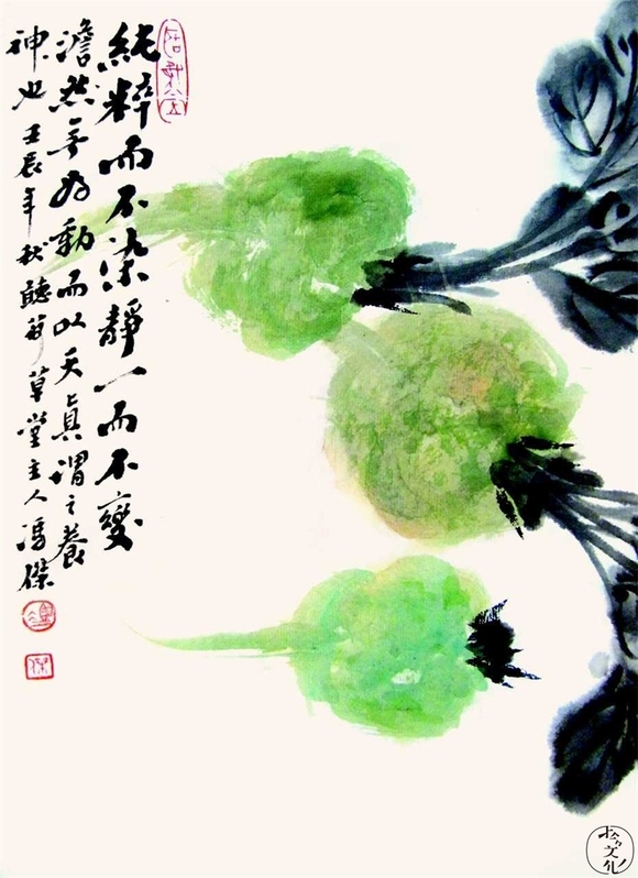 去年,我把他的另一本集子《吃饭》买回来,一夜一夜,在灯下爱不释手,尤喜那些水墨,简单平易,三笔两道的,不过是些蒜头茨菰之类。叫人一遍遍看,心悦诚服,真是个浸透生活滋味的老者,日常的一点一滴在心里漫过,滚过,慢慢沉淀下来,慢慢落笔,然后就如此神乎其神的生动,不羁,调皮,略有牵牵绊绊的萦绕,然而,又有所低徊……