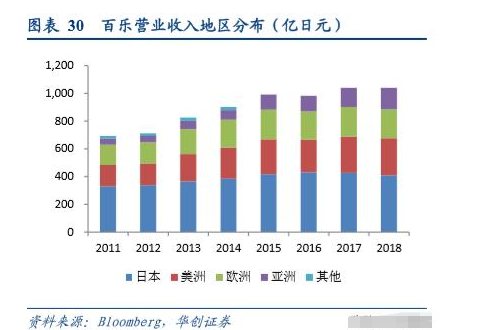 日本地区的营业收入只占百乐营业收入总额的40%,且这一比例还在不断减少,亚洲其他地区发展迅猛,营业收入从2011年的42.6亿日元发展到2018年的154.6亿日元。