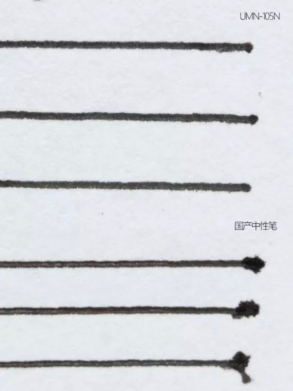 对比三菱和国产中性笔写出的笔画,明显能看出国产笔溢墨现象很严重。