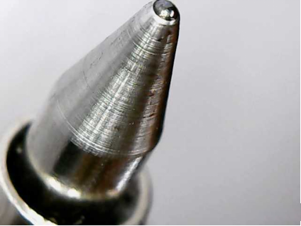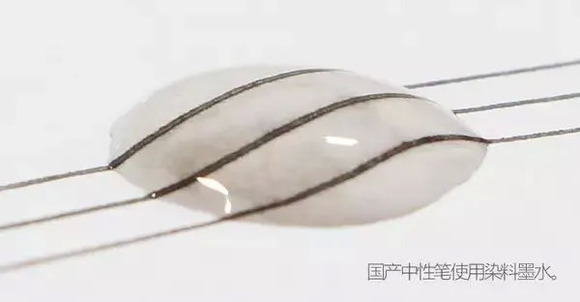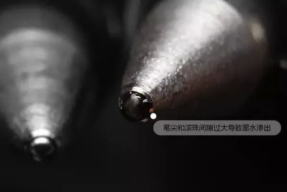 对比国产笔笔尖和日本笔笔尖,可以看出国产笔笔尖过于粗糙,滚珠和笔尖之间缝隙太大,结果导致还没书写,油墨就渗出。