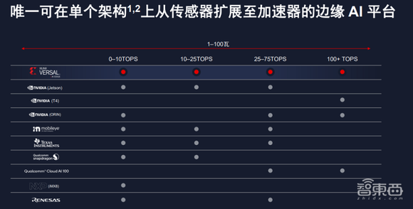 而且Versal AI Edge也是唯一一个支持从0-100+TOPS算力区间的边缘AI芯片。其他的平台都在部分算力区间上存在空白,需要多个芯片联动才能支持全算力区间。Versal AI Edge单一平台就可以满足客户的各类需求,可以使部署更加灵活,并在功耗和成本上更具优势。