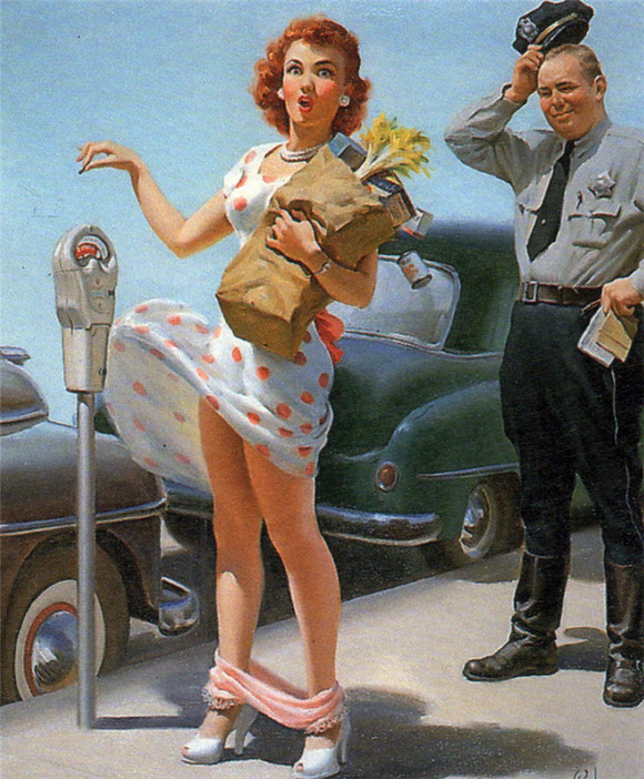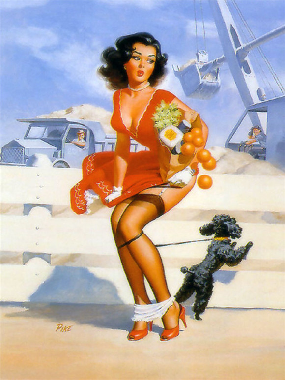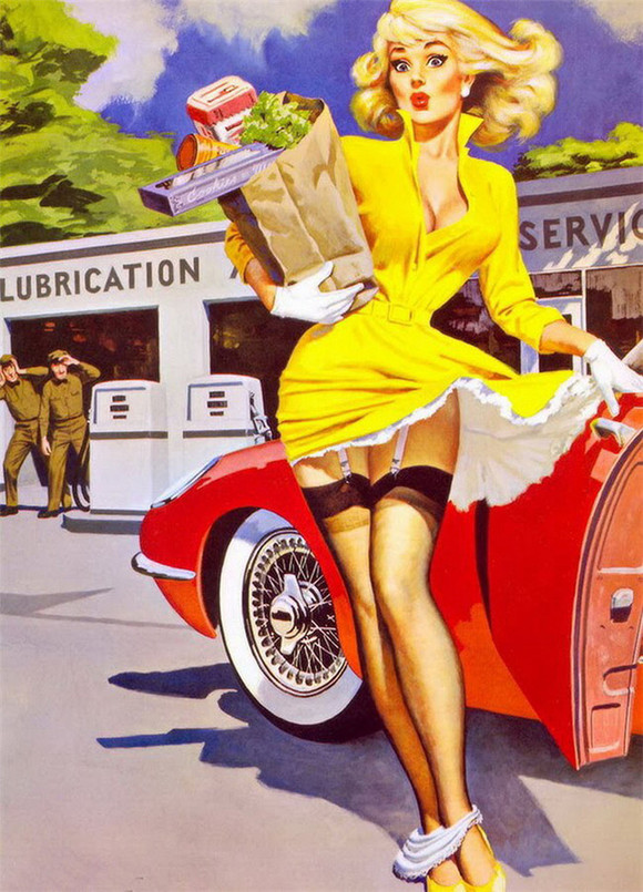我在一个偶然的机会看到了一些Art Frahm的作品。Art Frahm是一位出生于芝加哥的艺术家,在上世纪四十至六十年代之间创作的美女招贴画小有名气,尤其是“窘迫的女郎”系列,画中洋娃娃般的美女们因内裤掉下来而花容失色。