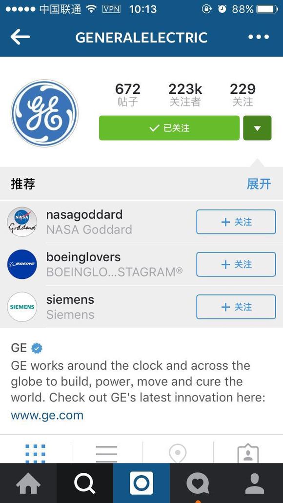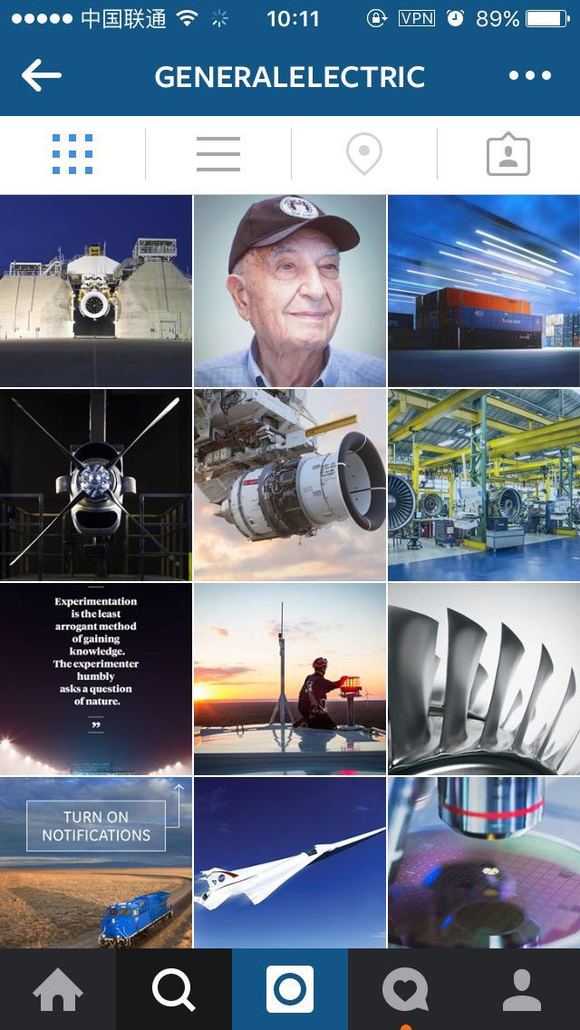 Instagram是GE成功通过检测的社交工具之一。目前,已经接近223000人关注了它的Instagram账号。通过“#instawalks”,GE邀请了有影响力的人进入工厂并在instagram分享他们的经历。康贝丝说:“它让大家看到平时难以见到的东西。大多数人想知道事物是如何运转的,GE通过它来激发着每个人心中的极客。”