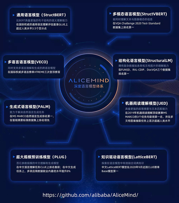 由阿里巴巴达摩院历经三年研发的AliceMind模型体系,即是以StructBERT为核心,拓展到多语言、生成式、多模态、结构化、知识驱动等领域,将跨语种、多模态的信息打通。