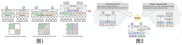 VECO目前支持100种语言的理解和生成任务。其出色表现主要源于两项创新:一是其可以更加“显式”得进行跨语言信息的建模(图1);二是VECO在预训练的过程充分学习用于NLU和生成NLG任务,并让二者互相学习提高彼此(图2)。