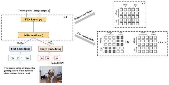 此外,模型利用attention mask矩阵控制实现双流架构,从而提升跨模态双流建模能力,结合单流、双流结构的优点进一步提升模型对文本和图像两个模态的理解能力。相关文章已被顶会ACL2021录用。