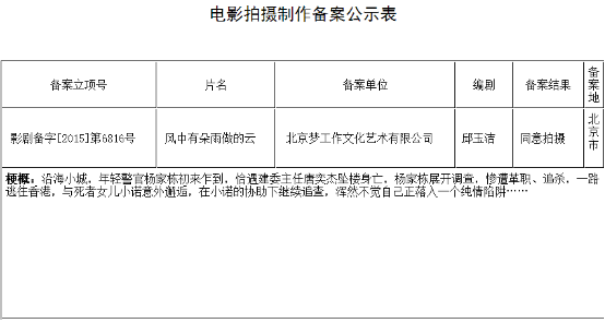 首先,一部电影如果要想拍摄,必须得在总局备案先,而《风中有朵雨做的云》也的确曾经正式备案。备案信息显示,影片由邱玉洁编剧,北京梦工作文化艺术有限公司申报立项。