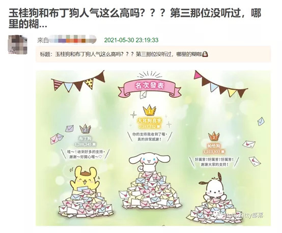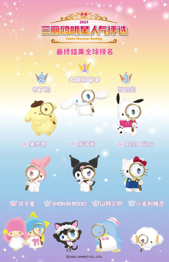 可以说“三丽鸥明星人气评选”是鼻祖级的选秀,并且激烈程度并不比如今的各种选秀节目弱,2021年的“三丽鸥明星人气评选”总票数有2134万之多,还有“中间结果”这样的刺激各位明星IP粉丝投票的环节,同样的面对这些可爱的IP们,粉丝也展开了不少的打投活动,交流中还混入了不少娱乐圈黑话。