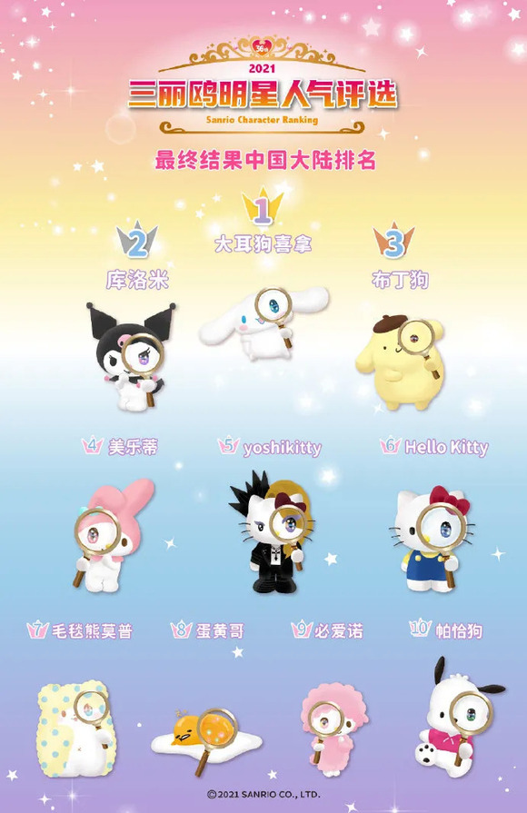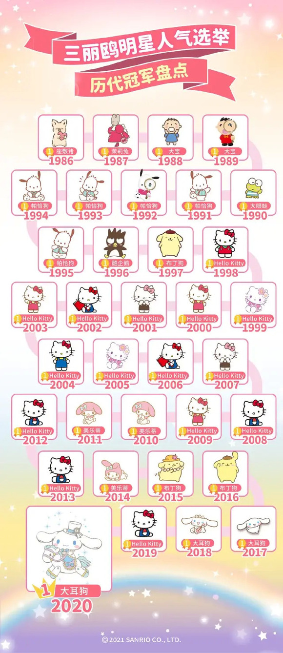此后除去2019年大前辈Hello Kitty因出道45周年纪念超过玉桂狗勇夺第一,2017和2018以及2020和2021两次的双连冠,都稳定了玉桂狗的四代顶流地位,其粉丝积累也越来越深厚。