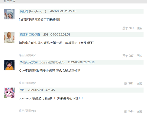 在豆瓣关于“三丽鸥人气明星评选赛”选手发言的帖子中,热评里就直接出现了两家粉丝的对立发言。