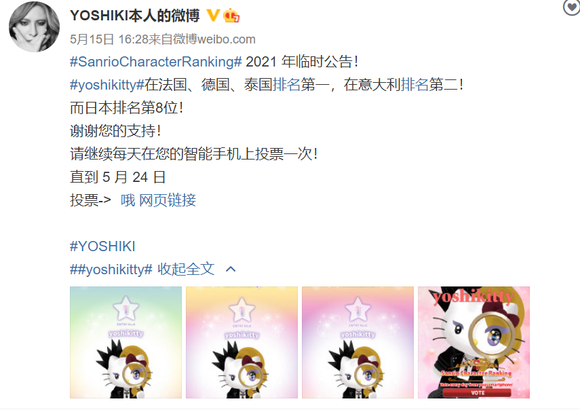 此外为了自己喜欢的角色IP在人气评选中获胜,不少现实明星也会纷纷下场打投拉票,最典型的例子莫过于“Yoshiki Kitty”,一个日本知名视觉系乐队成员Yoshiki和三丽鸥合作产出的角色IP,被Yoshiki当做自家闺女。