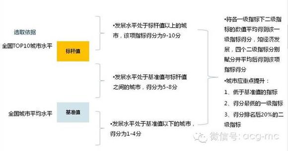 这一可持续发展指标体系用以指明城市未来发展方向,也可用于判断某一城市当前发展的短板和重点提升方向。为便于应用,我们选取各指标的国内TOP10城市作为标杆值,全国城市平均水平为基准值,城市根据自身发展现状予以赋分, 寻找发展中存在的不足和改进方向。