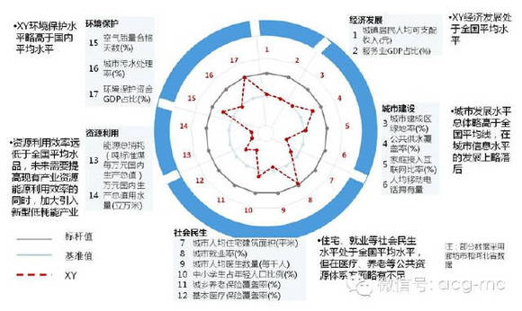 以XY市为例,将各项指标与基准值及标杆值对比,得出城市发展现状分析图。从城市发展角度而言,XY当前发展总体处于全国平均水平,但民生保障落后,资源利用率仍较低,城市发展未来应关注产业转型、城市民生改善。未来,XY需在经济建设、资源利用效率、社会民生方面加大投入和建设力度。