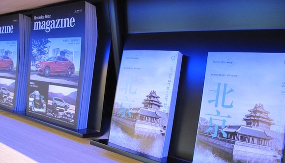 沿着浅色木质楼梯往上,迎面便是投射着Mercedes me字样的平面。左侧墙壁由绿色植物装饰,并且放置着奔驰自己制作的汽车杂志甚至北京旅行指南以供取阅。