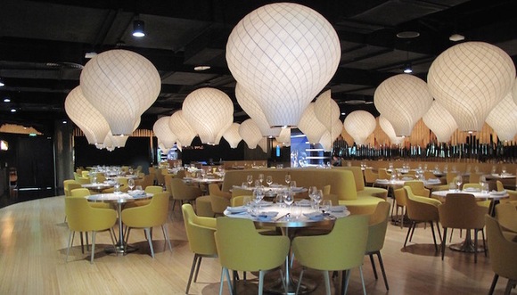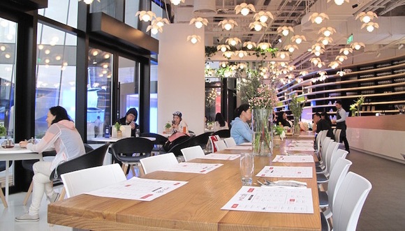 me café的装修风格明亮清新,灯饰呈鲜花盛开状。