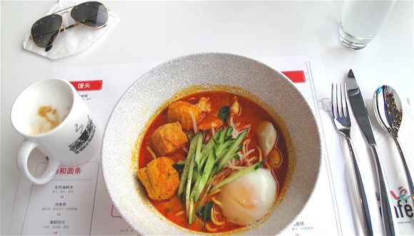 配有温泉蛋的海鲜叻沙拉面五星推荐。它的汤汁味道浓郁,酸、甜、辛辣混合得恰到好处。拉面口感软硬适中,且颇为入味。而虾肉、鱼豆腐以及黄瓜丝、豆芽等配料可以吃出食材的新鲜程度。