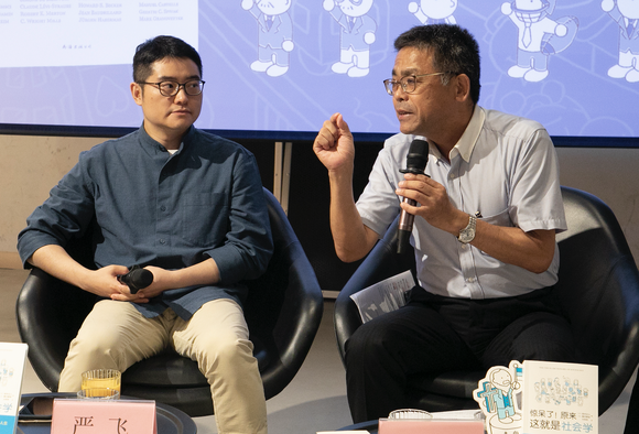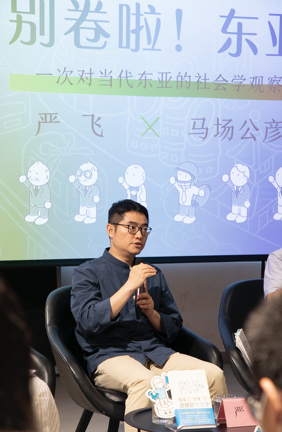 《惊呆了!原来这就是社会学》以图鉴的形式,帮助普通读者认识社会学概念,介绍不同的社会学理论、社会学脉络,其中涉及的76个社会学家,他们的作品也几乎都已经被翻译成了中文。此次活动上,严飞与北京大学外国语学院外籍专家、日本岩波书店前总编辑马场公彦探讨了社会学在当下中国热门的现象。两位嘉宾还探讨了中国当下流行的“内卷”、“摸鱼”等词,以及日本如何在这些问题上给中国以启发。马场公彦认为,内卷问题的关键就在于目前中国人的价值观过于单一,其实,每个人都是“世界上唯一的花”。