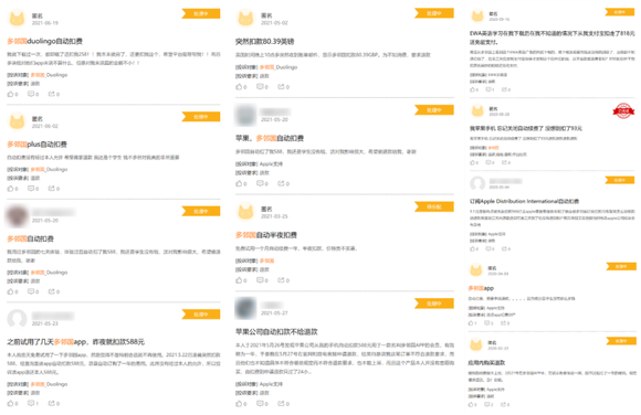 目前,上述多条投诉中,仅有一条“苹果手机忘记关闭自动续费”,要求退还93元的投诉已完成处理,其余投诉仍处于处理中的状态。