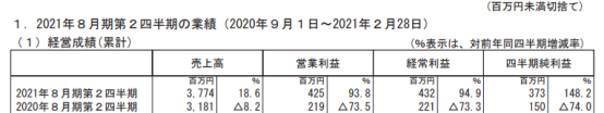 根据ほぼ日最新发布的2021年8月期第二季度(2020.9.1-2021.2.28)财报,销售额37亿7400万日元,同比增长18.6%;营业利润4亿2500万日元,同比增长93.8%;经常利润4亿3200万日元,同比增长94.9%;当期纯利润3亿7300万日元,同比增长148.2%,实现大幅增收增益。