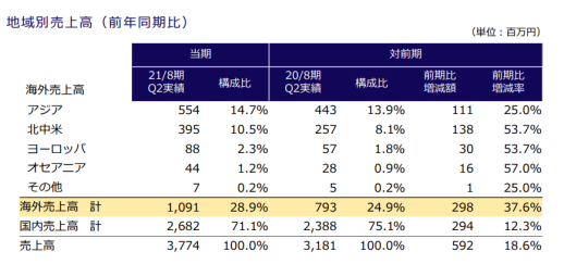 在销路方面,虽然受疫情影响批发销路有所减少,但直营销路以及中华圈、北美地区为中心的海外销售情况良好。亚洲地区销量占海外销量的近一半,二季度销售额为5亿5400万日元,同比增长25%,其次是北美地区,销售额3亿9500万日元,同比增长53.7%。