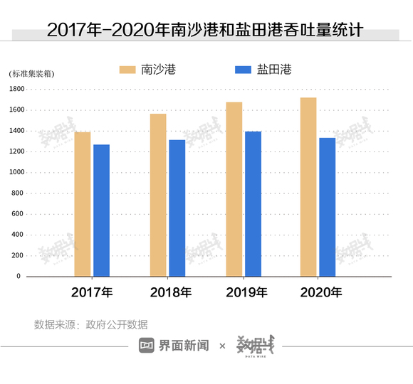 2016年,广州南沙港的吞吐量达到1262.2万个标准集装箱,同年,深圳盐田港集团的盐田港区为1170万个标准集装箱——也正是在这一年,南沙港的集装箱吞吐量超过了盐田港,并在此后一直保持领先。