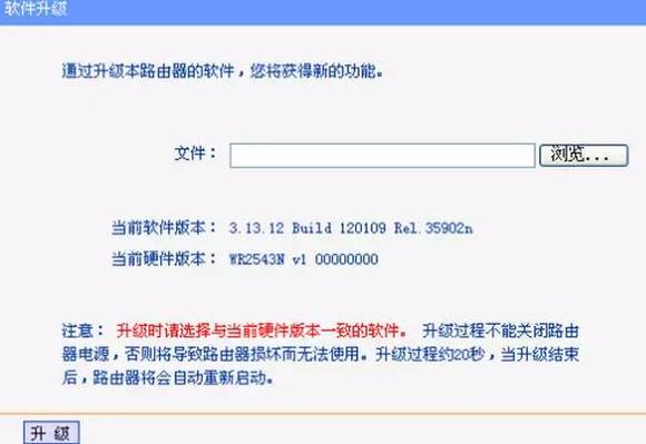 点击 浏览 按钮选择下载的文件 openwrt-ar71xx-generic-tl-wr2543-v1-squashfs-factory.bin。注意,文件名必须是...factory.bin。