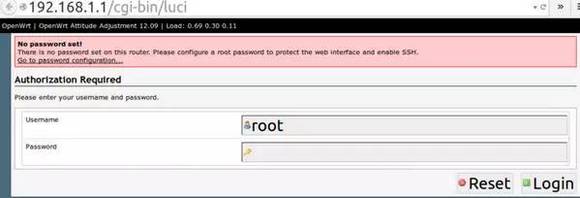 等锁形的指示灯不闪了,在浏览器输入地址: 192.168.1.1 回车,如果正常的话,就进入了 OpenWrt 的LuCI网页管理界面了。