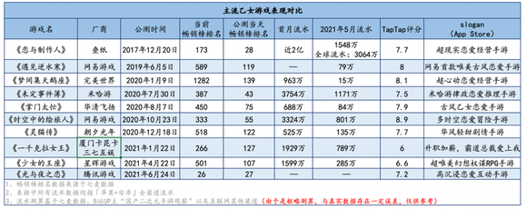 然而自《恋与制作人》面世引起女性玩家“追逐”后,似乎所有人都认为乙女向游戏开始走向破圈,从而参与其中的头部厂商开始越来越多,然而从游戏魔客整理的市场上目前「主流乙女游戏表现对比」的数据来看,事实的真相却并非如此,乙女市场比想象中的要“凄凉”。