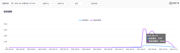 7月之后,虽然《光恋》的投放力度依然强劲,但整体趋势下滑,7月7日的投放素材数已经跌至1000左右。