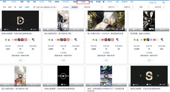 值得注意的是,在所有播放量较高的素材中,以“沉浸式恋爱”、“甜蜜”、“心动”、“悸动”为关键词的视频点赞数最高,这其实也说明乙女玩家对于恋爱沉浸感的核心诉求。
