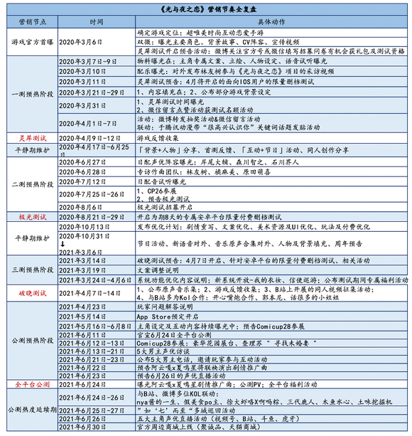 《光恋》的第四个阶段是2021年4月23日至2021年6月24日的公测期间,表格显示其公测的预热期到最后引爆为两月,这样的时间长度目前在游戏公测时是较为常见。