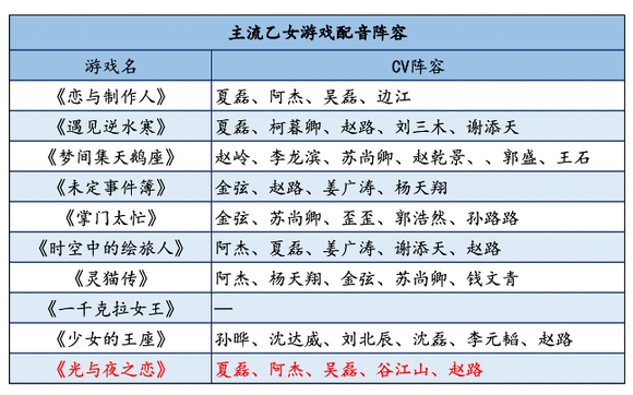另外由于国内近几年逐渐成熟的声优文化,几乎所有游戏都拥有一支堪称豪华的声优团队,《光恋》当然也不例外,在尊重每个角色性格需求的基础上,《光恋》的中配团队请来了夏磊、阿杰、吴磊、谷江山、赵路五位顶级声优加盟,配合角色独立语音的试听在该时间段逐渐放出。