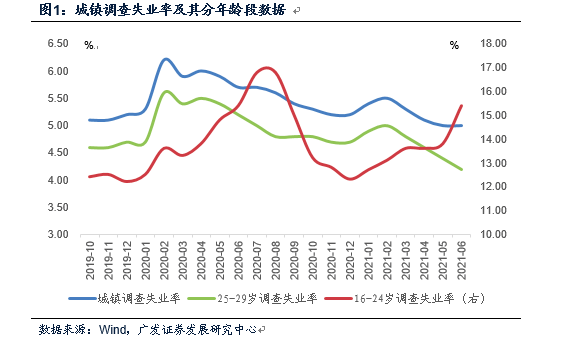 所以,16-24岁调查失业率的走高主要与“毕业生供给增加+疫后就业岗位减少”所形成的结构性缺口有关,不完全由经济边际变化导致,至少不能被当作经济增长承压的证据。更能反映经济边际变化的25-29岁人口的调查失业率2021年2月触顶在5.0%以来,已经连续4个月下行,6月数据为4.2%,环比回落0.2个点。外来农业户籍人口失业率自春节后亦连续回落,6月份为4.7%,较3月份下降0.7个百分点。
