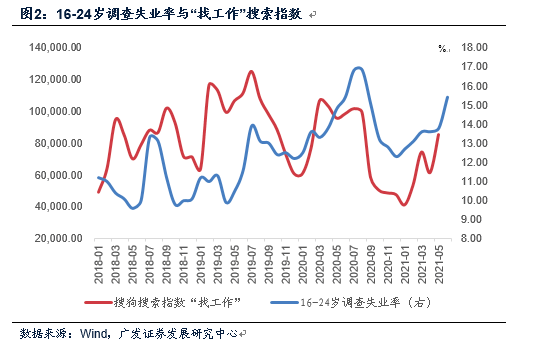 16-24岁人口主要是毕业生,包括高中、职高和高校毕业生。这一口径有数据以来的历史均值是12.5%。数据在6月的走高存在季节性原因,历年毕业季的6-8月几乎都存在这一特征。2020年的年内高点也是位于7-8月。搜索引擎“找工作”搜索指数与16-24岁调查失业率的历史走势吻合,可以相互印证。
