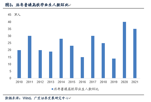 2016-2021年教育部普通高校毕业生口径毕业人数分别为765万、795万、820万、834万、874万、909万,环比前一年增长分别为15万、30万、25万、14万、40万、35万,2020-2021年环比均值的37.5万是2010年以来最高,明显超过2010-2019年年均值的22万。