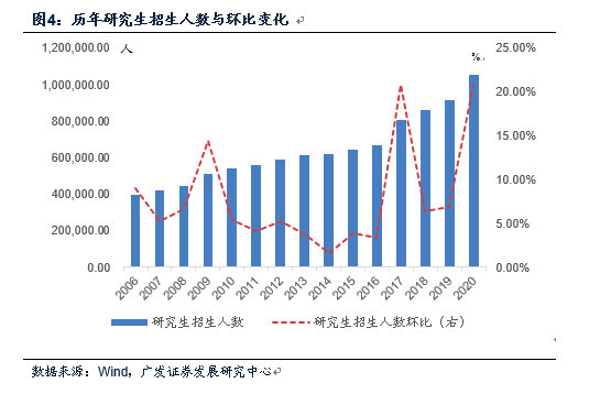毕业人数的走高与前期招生节奏有关。以研究生招生为例,2015-2019年研究生招生分别为64.5万、66.7万、80.5万、85.8万。2017-2018年招生人数存在一个跃升,这会带来2020年前后研究生毕业人数的走高。2020年研究生毕业人数达72.9万,环比2019年增加8.9万,这一增幅远超趋势值;前期数据递推可知2021年亦压力不减。