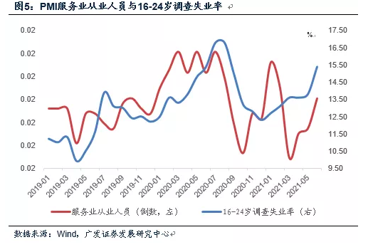 如果我们把PMI就业指标当作观测指标,会发现相对于制造业来说,服务业就业兴衰与青年人群调查失业率之间相关性更高。这可能和服务业吸纳就业的弹性更大有关。