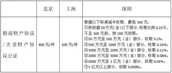 我们以北京市方圆公证处、北京市信德公证处,上海市东方公证处、上海市闵行公证、广东省深圳市深圳公证处、广东省深圳市福田公证处为例,梳理了办理婚前财产协议及婚内财产协议公证的收费标准,详见下图: