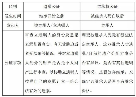 需要提示各位读者,遗嘱公证和继承权公证是两个分开、独立的公证活动。以下简单列举一下遗嘱公证和继承权公证的核心区别: