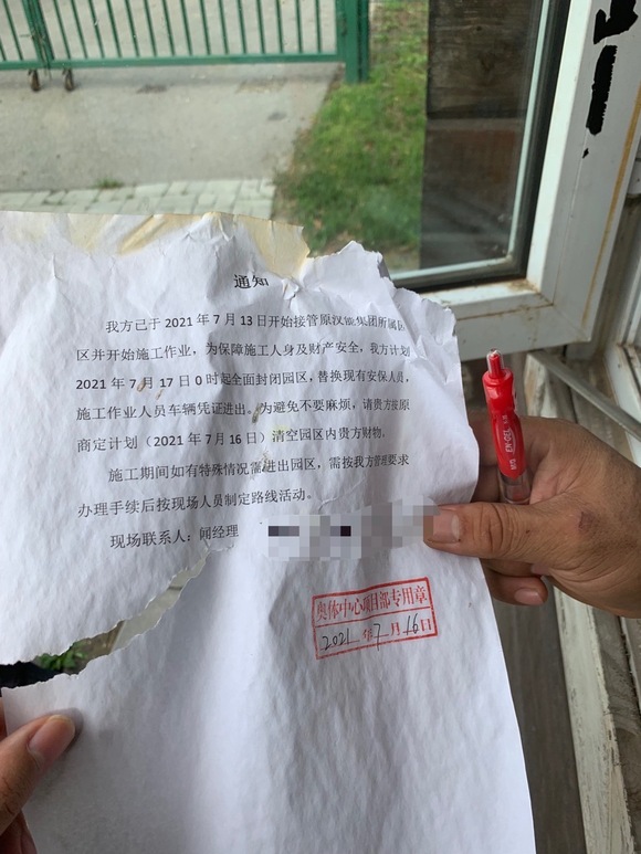 界面新闻获得的一份7月16日下发的盖有“奥体中心项目部专用章”的《通知》显示, “我方于2021年7月13日开始接管原汉能集团所属园区并开始施工作业,为保障施工人身及财产安全,我方计划2021年7月17日0时起全面封闭园区,替换现有安保人员,施工作业人员车辆凭证进出。为避免不必要麻烦,请贵方按原商定计划(2021年7月16日)清空园区内贵方财物。”