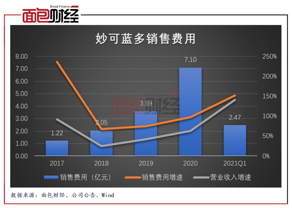 然而,公司靓丽业绩较多依赖广告投放。分析发现,近几年公司销售费用增速超过营业收入增速。以2020年为例,公司销售费用达到7.10亿元,约占总收入的四分之一。其中,广告促销费高达5.61亿元,占销售费用的78.94%。