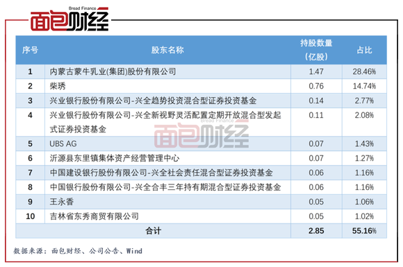 本次发行后,内蒙蒙牛持股比例达到28.46%,从第二大股东晋升为公司控股股东;原实控人及控股股东柴琇女士的持股比例由18.32%下降至14.74%,成为第二大股东。由于内蒙蒙牛的间接控股股东蒙牛乳业为香港上市公司且其股权结构较为分散,因此公司不存在实际控制人。
