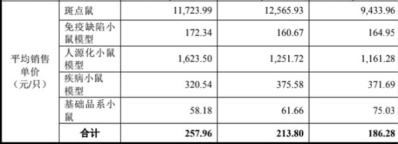 招股书显示,报告期每只小鼠模型的平均单价均达到了200元左右,其中斑点鼠平均售价过万,人源化小鼠2020年单价也近两千。