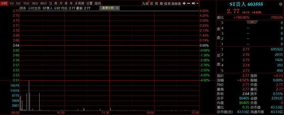 7月26日,ST贵人开盘一字涨停,封单量一度达到200万手,截止收盘,ST贵人(603555)封单量仍近70万手,股价报收于2.77元,总市值43.5亿。