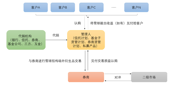 基本结构是券商在二级市场的对冲行为为基底,信托、券商资管、基金子公司、私募等设立资管产品,银行、信托、券商等作为代销机构,向投资者发行。