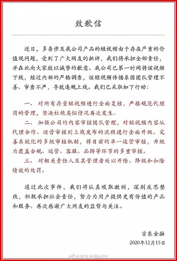 对此,京东金融官方于去年12月发布致歉信,承认多条短视频存在严重的价值观问题,将为此承担全部责任。