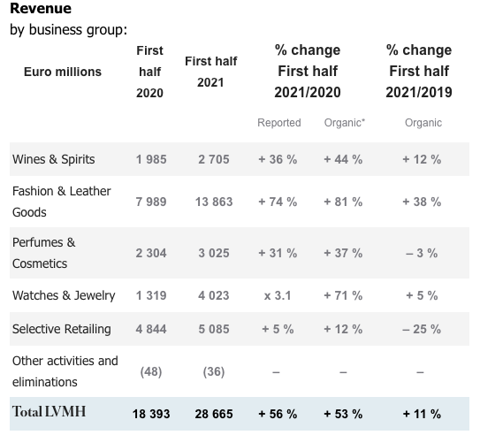 近日,法国奢侈品巨头LVMH集团发布2021上半年财报。